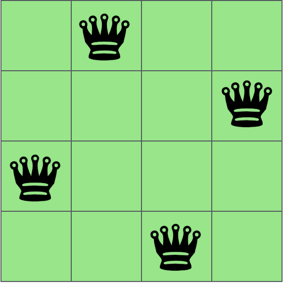 Para vencer o problema, duas rainhas nunca podem compartilhar a mesma linha, coluna ou diagonal.